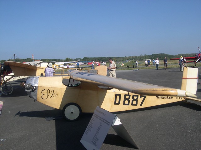 Er möchte noch eine Bleriot bauen, sagt er, aber es gäbe keine Originalmotoren mehr und die nachzubauen sei fast unmöglich. Er hat noch eine zweite Maschine mit nach Darmstadt gebracht, eine in Schweden in Lizenz gefertigte Focke Wulf Fw 44 Stieglitz. Später wird er etwas Kunstflug damit zeigen, sagt er, aber vorsichtig, denn die Stieglitz gehört eigentlich seiner Frau. Gleich neben der Bleriot wird nun die M17 zum Start fertig gemacht, der Pilot, ich schätze ihn auf mindestens 1,85m Körperhöhe, schiebt sich einem Schlangenmensch gleich in den hinteren Sitz. Er hebt die Hand, der Propeller wird angeworfen und tuckert brav los. Heute hat manches Motorrad mehr PS, aber nach kurzem Rollen ist das Maschinchen in der Luft und zeigt seine Fähigkeiten.